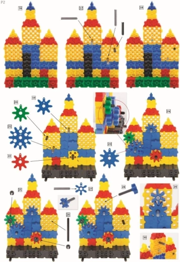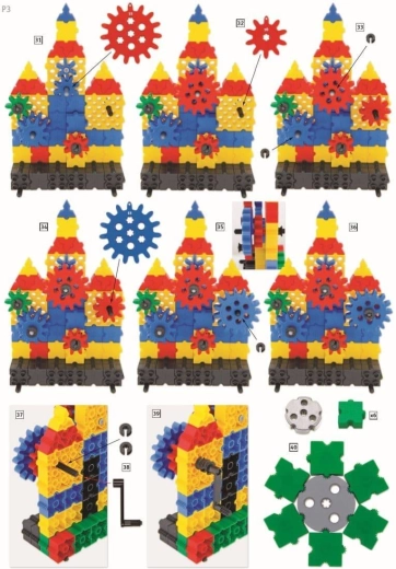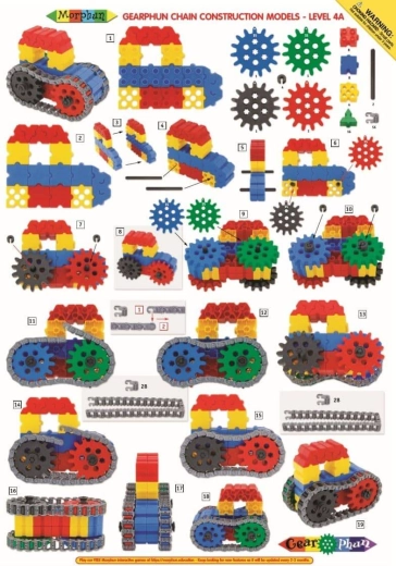 Sættet indeholder tydelige visuelle instruktioner, der fører børn fra simple opbygninger til mere avancerede konstruktioner med tandhjul og kæder.