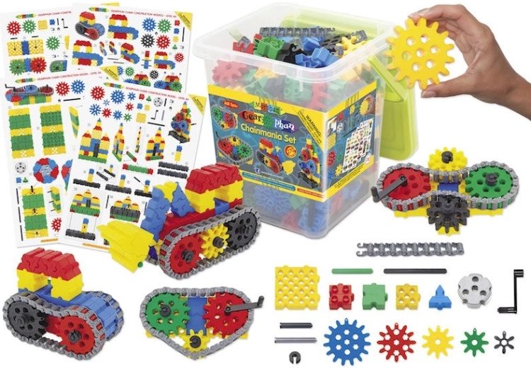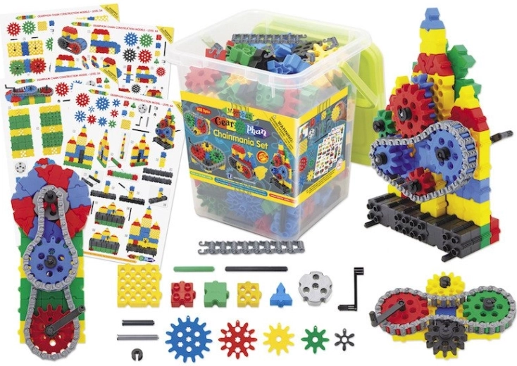 Fem størrelser tandhjul og en funktionel kæde gør det muligt at bygge modeller med jævn kraftoverførsel. Børn forstår intuitivt, hvordan delene arbejder sammen.