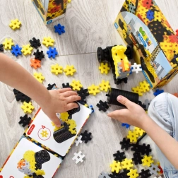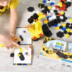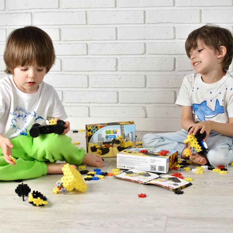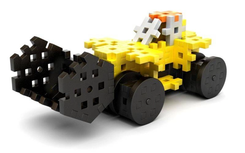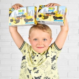 Byg en lille hjulgravemaskine med arm eller en kvik lille bil. Ét sæt – mange modeller til at udvikle fantasi og motorik.