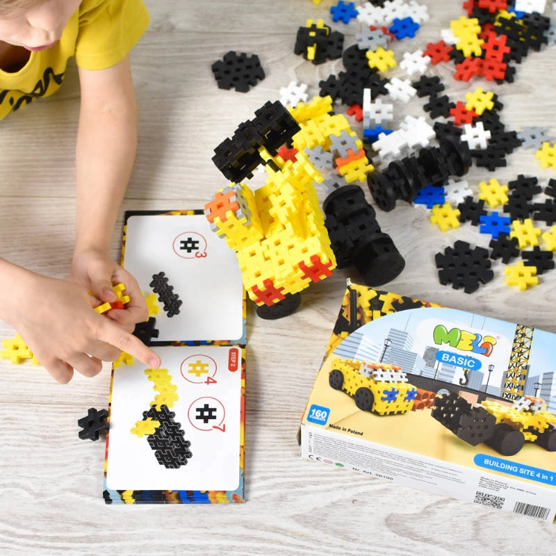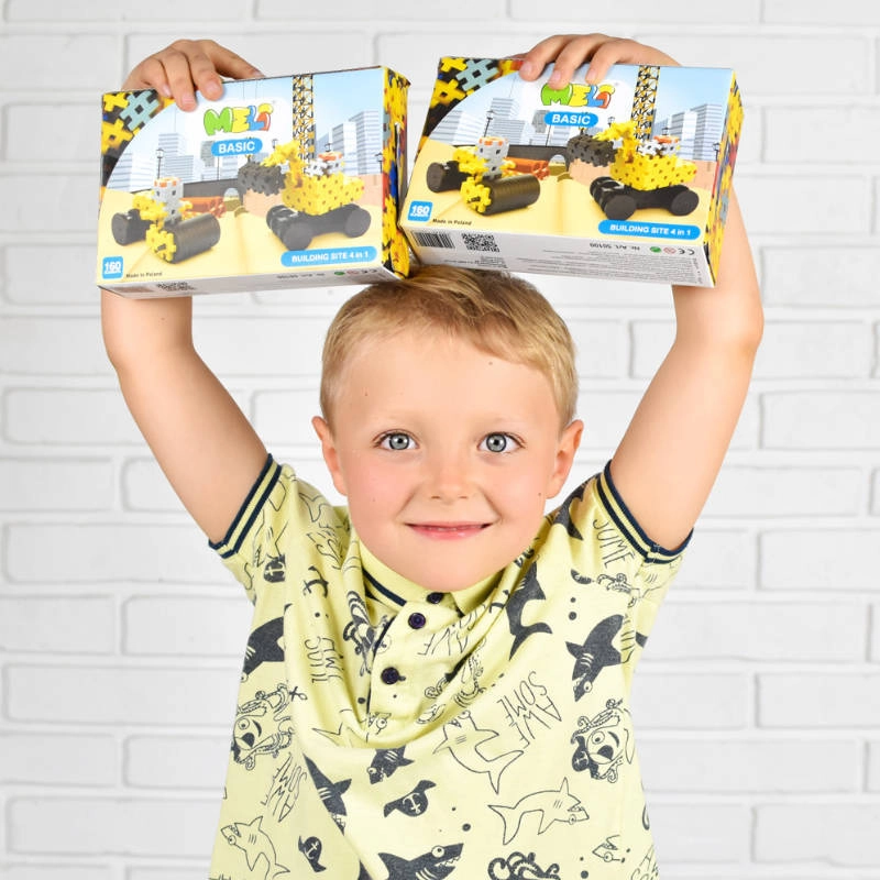 Det tematiske sæt Meli Byggeplads kombinerer leg og læring. Af 160 farvede dele og specialelementer (hjul, forbindelser, sekskanter) bygger du entreprenørmaskiner, køretøjer, bygninger og originale modeller. Delene klikker jævnt sammen, holder solidt og takket være det holdbare BPA-fri materiale tåler de intensiv leg.