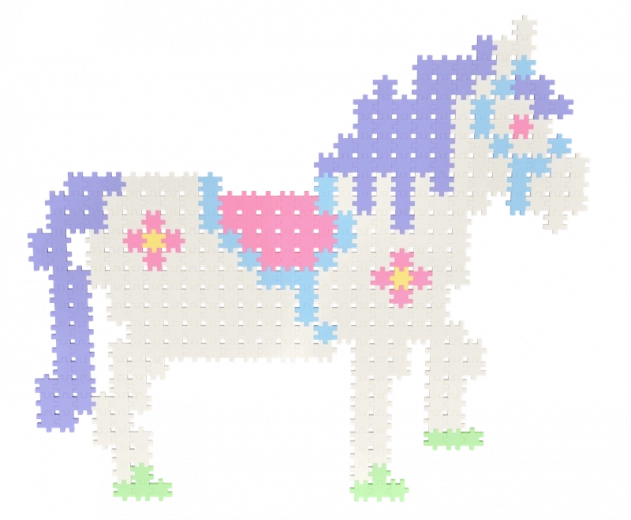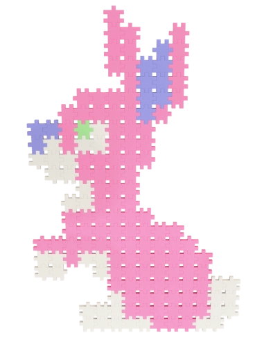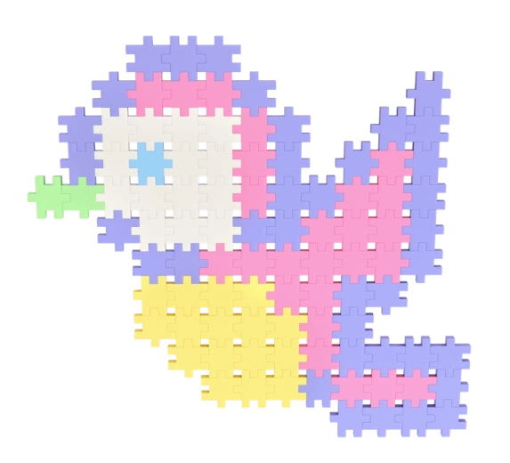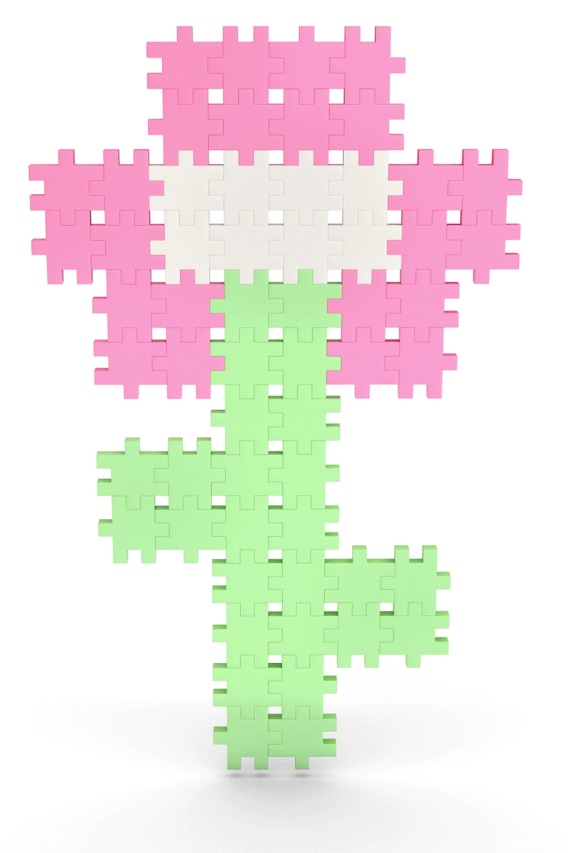Den ensartede form på de små brikker gør det let at bygge både flade billeder og rumlige konstruktioner – fra blomster og dyr til fantasifulde figurer.