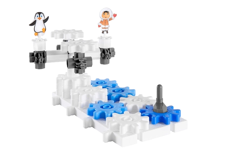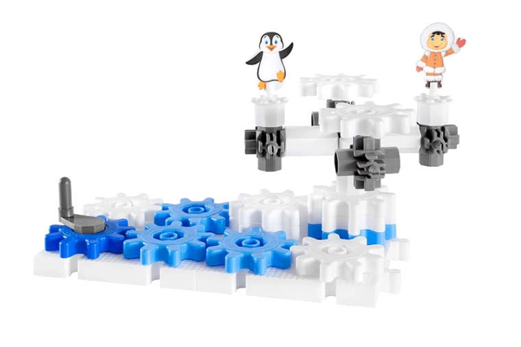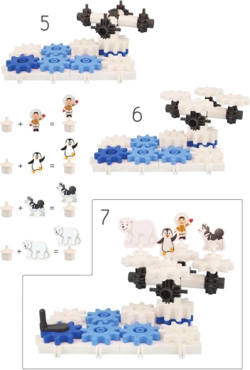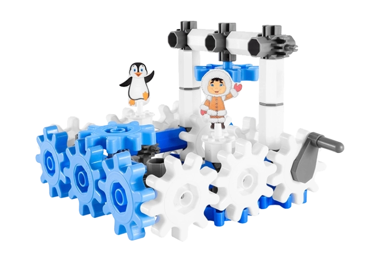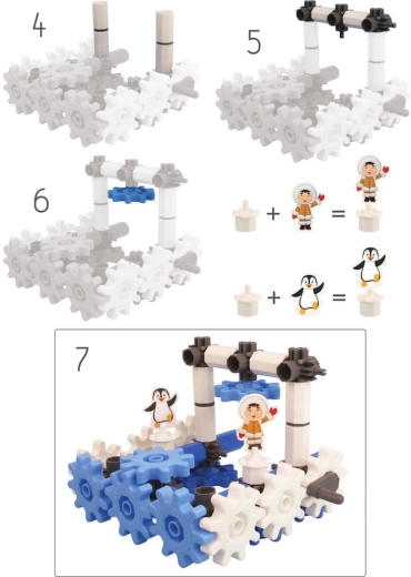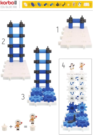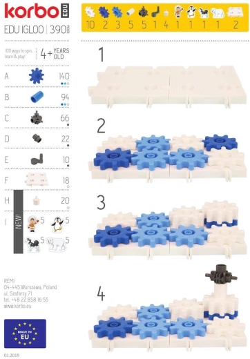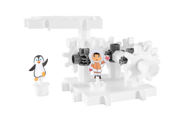 Et stort sæt Korbo-klodser i vinterfarver. Du kan også bygge to snemænd og et iglo med tag, der kan åbnes og lukkes. Ud over en isbryder, et isbjerg og en karrusel kan barnet skabe sin egen arktiske verden med figurer af en eskimo, en pingvin, en husky og en isbjørn.