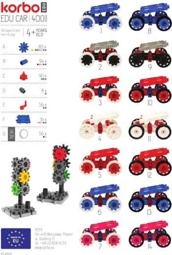 Korbo er kreative byggesæt med tandhjul, hvor intuition alene ikke rækker – der kræves kreativ, logisk tænkning. De er fremstillet af det sikreste materiale i højeste kvalitet, pakket i smukke pap- eller plastkasser og er et ideelt supplement til værelset hos små bygmestre. De uendelige muligheder for at bygge flerdimensionelle modeller udvikler og underholder børn i alle aldre. Bevægelige gearmekanismer hjælper med at forstå mekanikkens principper og udvikler samtidig rumlig fantasi og finmotorik. Korbo-byggesæt er ikke kun legetøj, men frem for alt en kombination af læremidler og god underholdning. Børn rækker ivrigt ud efter dem – fordi de giver udfordringer og langvarig, spændende leg. De gradvise modeller er en udfordring, og de mange muligheder gør det muligt for børn i alle aldre at finde deres egen idé til særligt kreativ tidsfordriv. Alle komponenter kobles let sammen, og modellerne er holdbare og mobile.