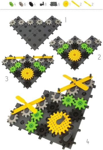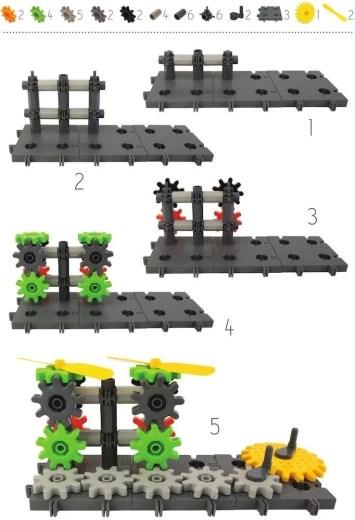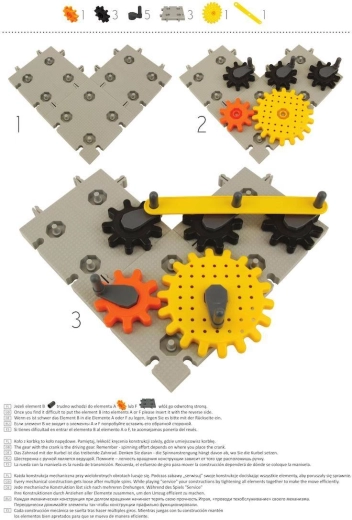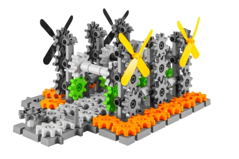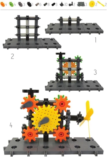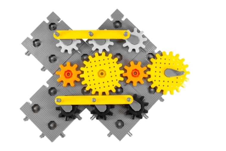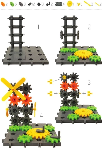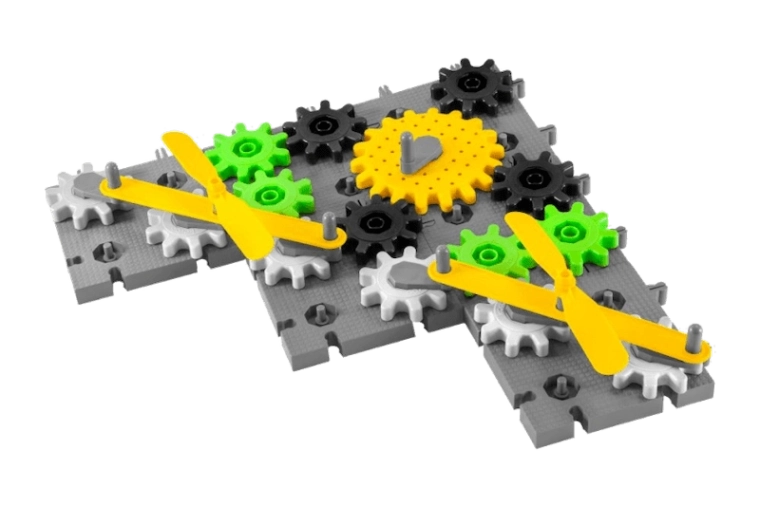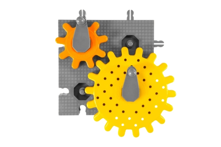 Tandhjul forbindes til en fungerende helhed – drej blot håndsvinget, og hele mekanismen går i gang. Børn forstår i praksis kraftoverførsel og rotationsretning.