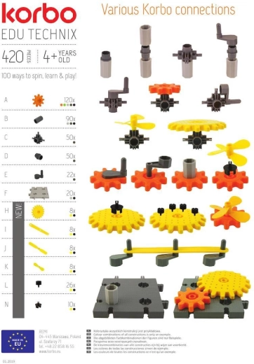 Konstruktionssættet KORBO Edu Technix 420 tilbyder et unikt system af tandhjul, aksler og baser, som lader børn skabe fungerende modeller – fra simple gear til komplekse mekanismer. Alt fungerer rent mekanisk uden elektronik, så børnene med egne øjne forstår principper som bevægelsesoverførsel, udvekslingsforhold og løftestænger.