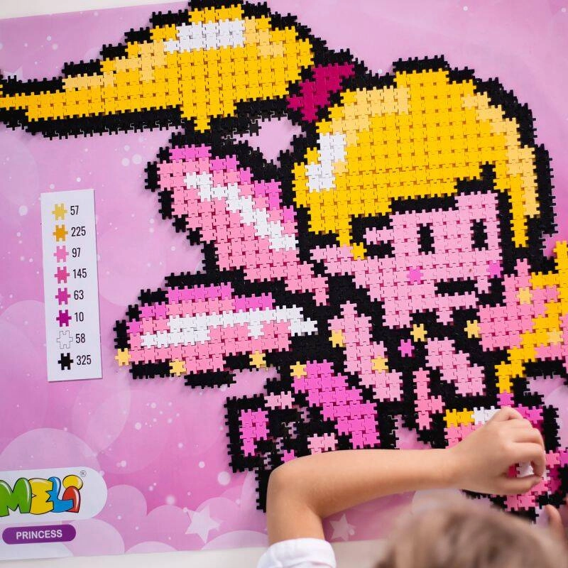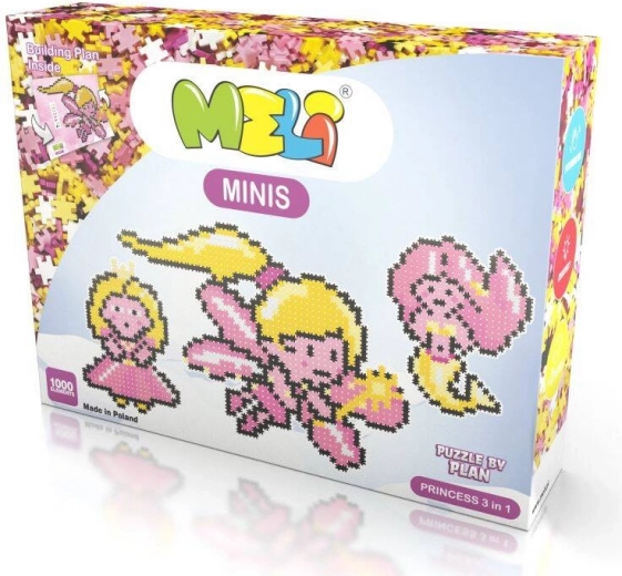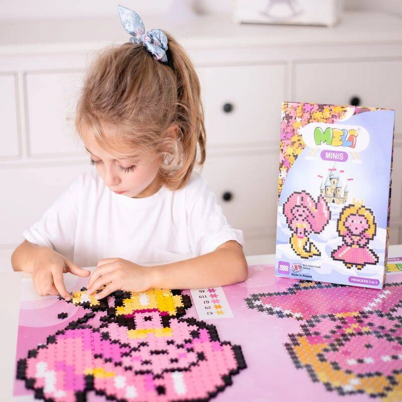 Forkæl en lille prinsesse med det magiske byggesæt Meli Minis Princess 3i1 med 1000 dele i blide farver. Takket være den store udfoldelige skabelon 69 × 48 cm kan der bygges efter forlæg i skala 1:1 eller skabes egne flade og 3D modeller. Klodserne er fri for BPA, ftalater og PVC, opfylder CE og EN-71 og understøtter kreativitet, tålmodighed samt læring af tælling og farver.