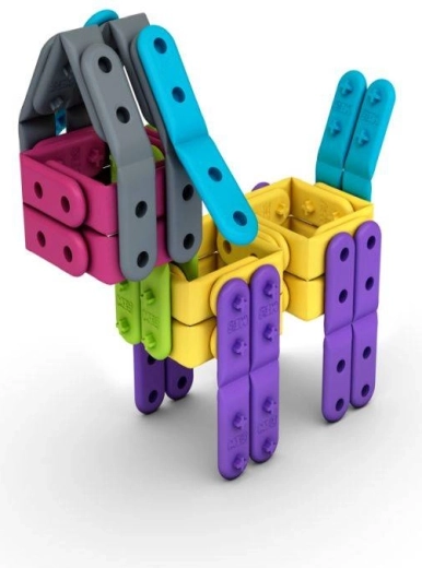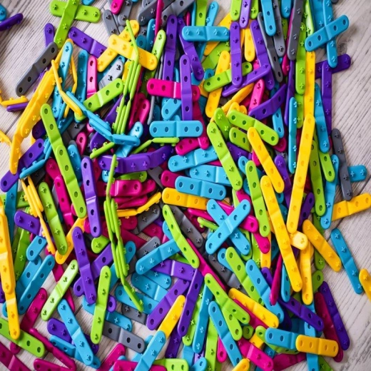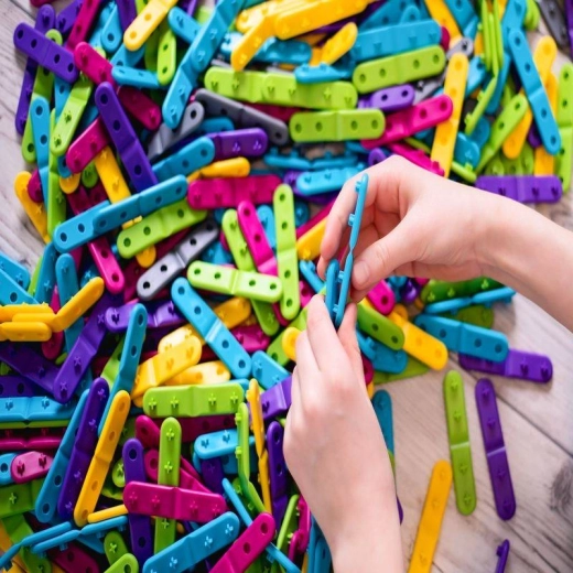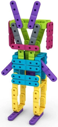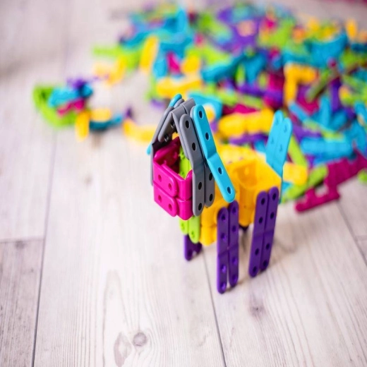 Stavene har afrundede kanter, som let forbindes ved hjælp af låse og huller, og de kan nemt skilles ad. Med de lange farvede strimler kan man skabe virkelig flotte bygninger, figurer og forskellige former. Det medfølgende instruktionshæfte hjælper med at starte eventyret med dette fantastiske sæt af usædvanlige klodser.