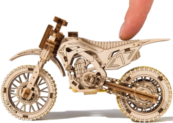 Saml din egen træ-MotoCross fra WOODEN CITY – en funktionsdygtig mekanisk model, der samles uden lim og værktøj. Takket være den inertidrevne mekanisme kører den op til 1 meter, har et let styrbart forhjul, gummibelagte hjul og et realistisk design i kvalitets birkekrydsfiner.