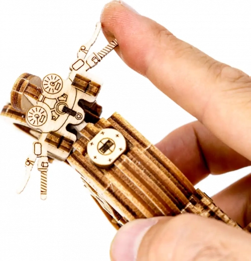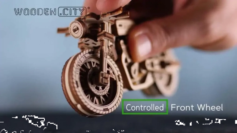 Café Racer-motorcyklen fra WOODEN CITY er en detaljeret træmodel i skala 1:16, der liver op på dit bord eller i din montre. Takket være gummimotoren og tilbagespændingsmekanismen bevæger modellen sig frem og tilbage, klarer en rækkevidde på cirka 1 meter og giver indblik i den ægte mekanik med tandhjul.