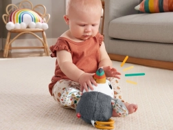 Denne bløde tukan glæder baby både på farten og derhjemme. Forskellige teksturer og kontrastfarver stimulerer syn og berøring, mens rangle og blid klang giver lydlige stimuli. Når man trækker i de nederste ringe, vifter tukanen glædestrålende med vingerne, hvilket lærer børn princippet om årsag–virkning og motiverer til videre udforskning.