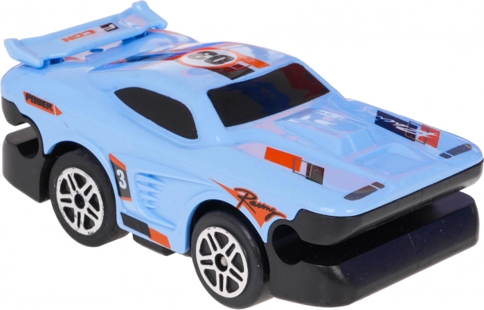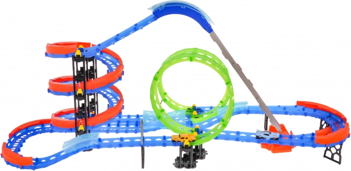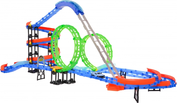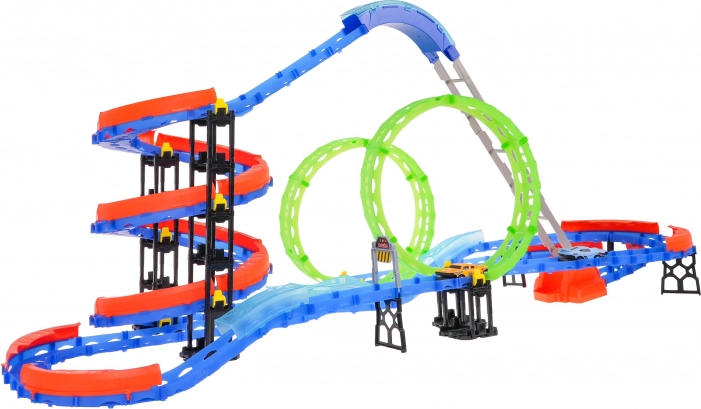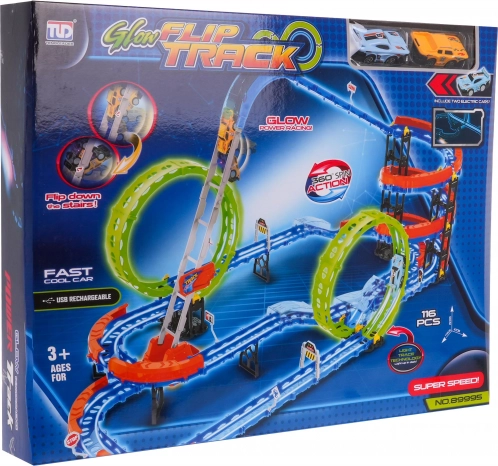 Dette farverige racersæt giver børn dynamisk underholdning med stejle opstigninger, et dobbelt 360° loop og sikkerhedsrækværk i svingene. Takket være fluorescerende elementer lyser banen i mørke, og kørslen bliver endnu sjovere. To lette racerbiler med LED-belysning drives af et indbygget 3,7 V batteri og oplades via USB.