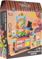 Farverigt byggesæt til små gør-det-selv-børn fra 3 år forvandler værelset til et kreativt værksted. Indeholder 92 dele inklusive en lille bil, funktionelle elementer og værktøj. Børnene vil nyde at bygge, rolleleg som mekaniker og træning af finmotorik. Der medfølger løftebænk, “kompressor” til at pumpe dæk, skruetrækker og skruenøgler, skabe der kan åbnes samt farverige klistermærker for et personligt look.