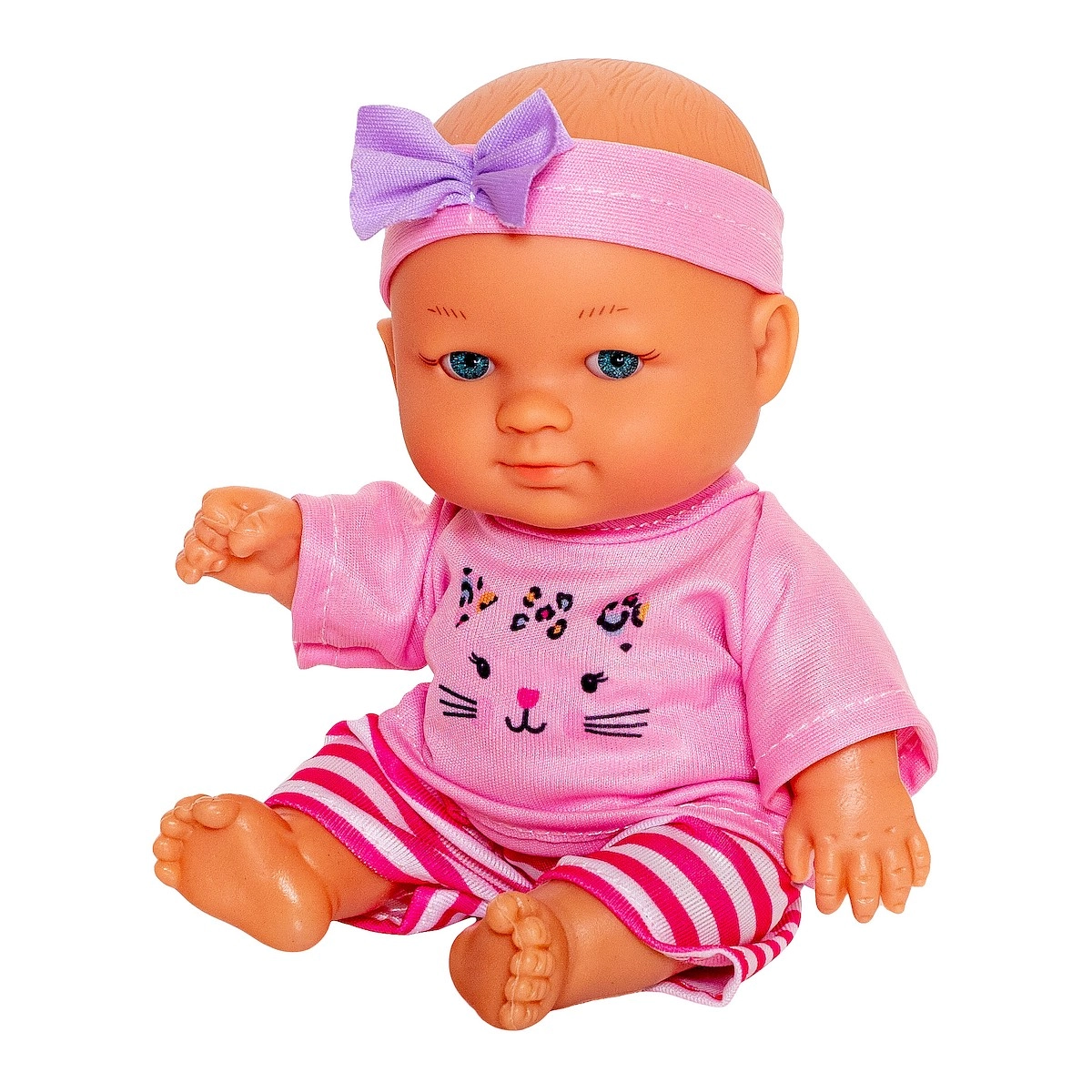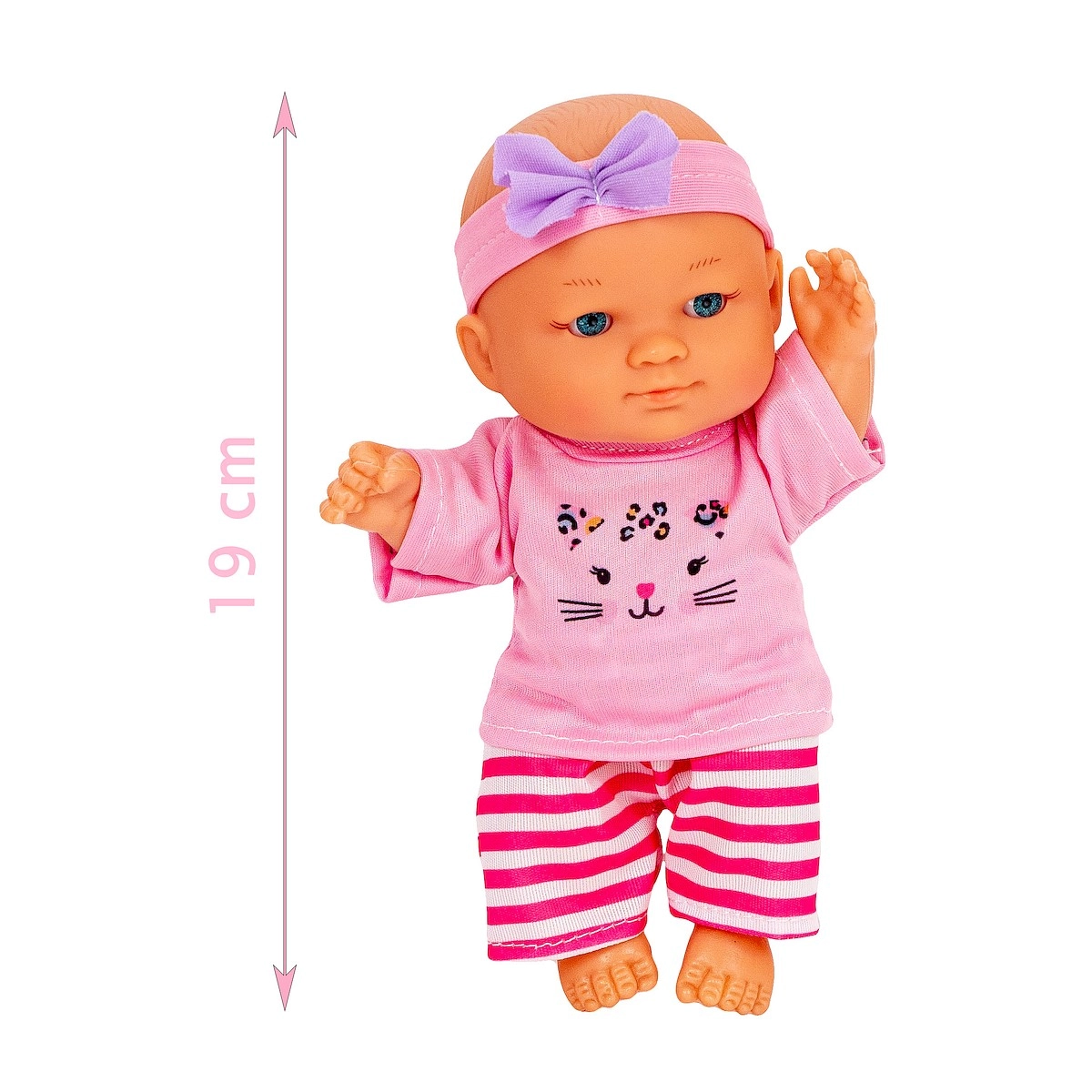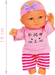 Julka har en lyserød top med katteprint, stribede leggings og en hårbøjle med sløjfe – nem at klæde om og indbyder til fantasifuld leg.