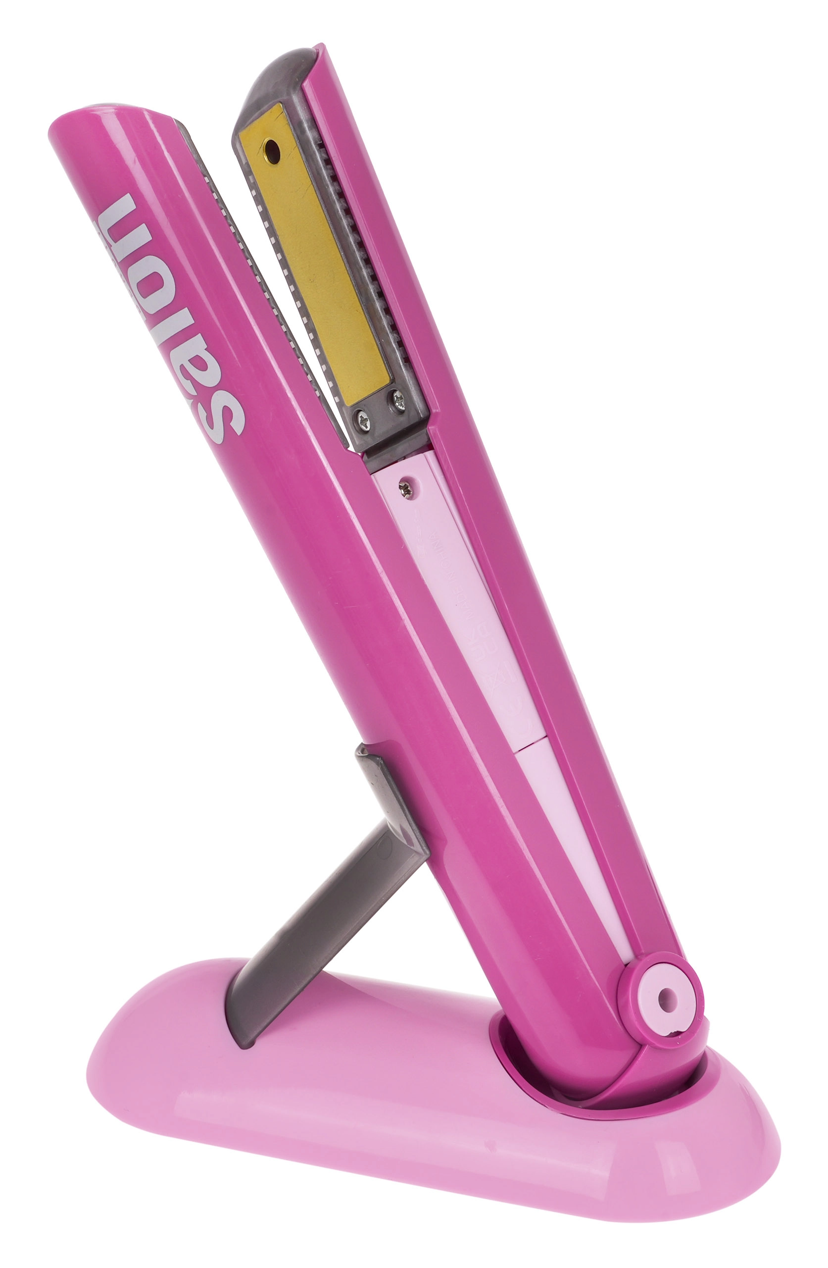 Det børnevenlige glattejern har en skyde-lås til åbning og lukning, lyser og ledsager “udglatning” af håret med autentiske lyde – perfekt til kreativ leg.