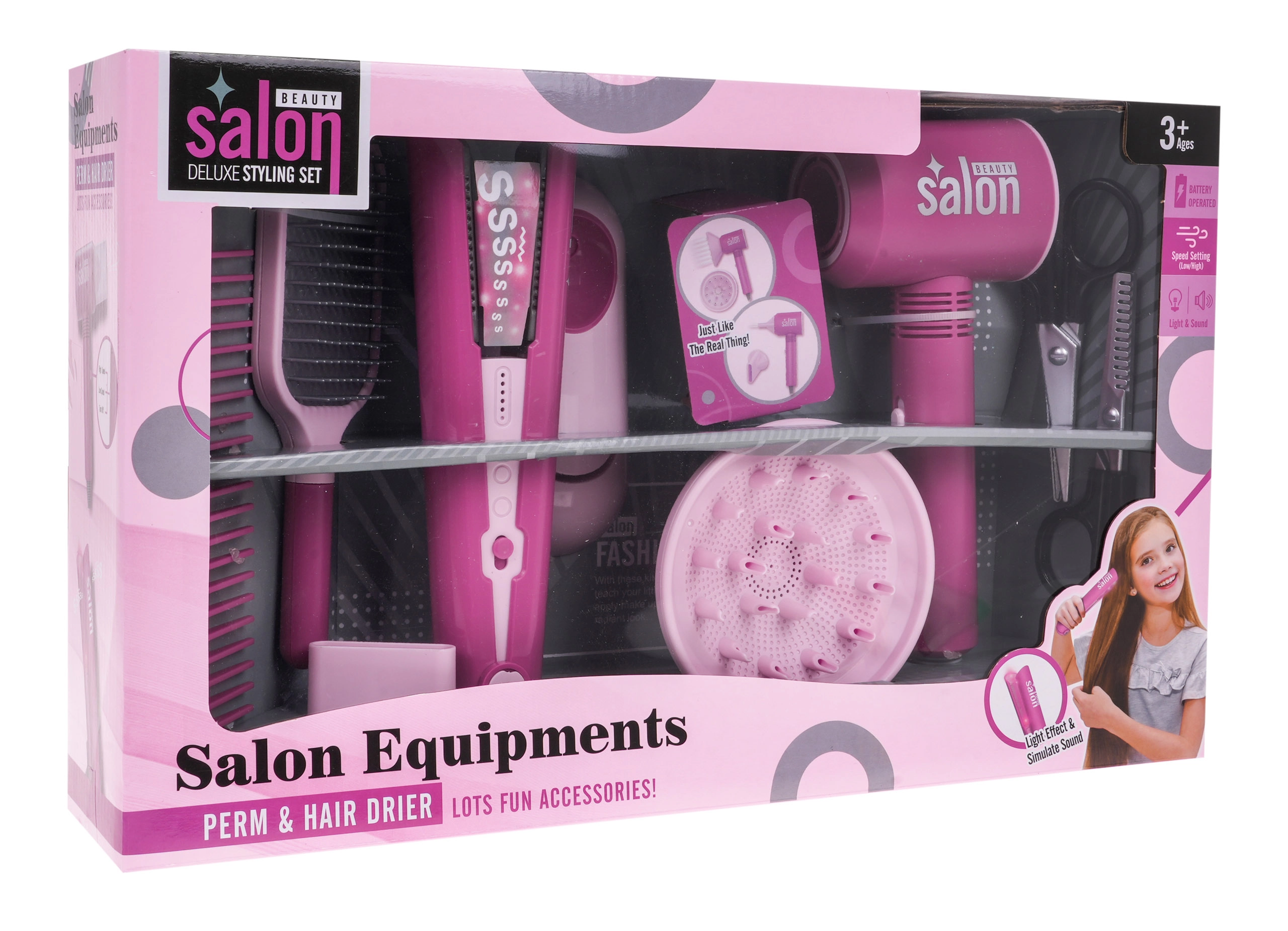 Opdag et sjovt frisørsæt til børn for små stylister fra 3 år. Sættet indeholder en funktionel batteridrevet føntørrer med udskiftelige mundstykker samt et glattejern med lys og lyd. Sættet byder på rigt tilbehør som saks, kam, børste og holder. Føntørreren blæser luft, har 2 effekttrin og afgiver realistiske tørrelyde. Glattejernet med lyseffekter og lyde giver endnu mere autenticitet til rollelegen som frisør.