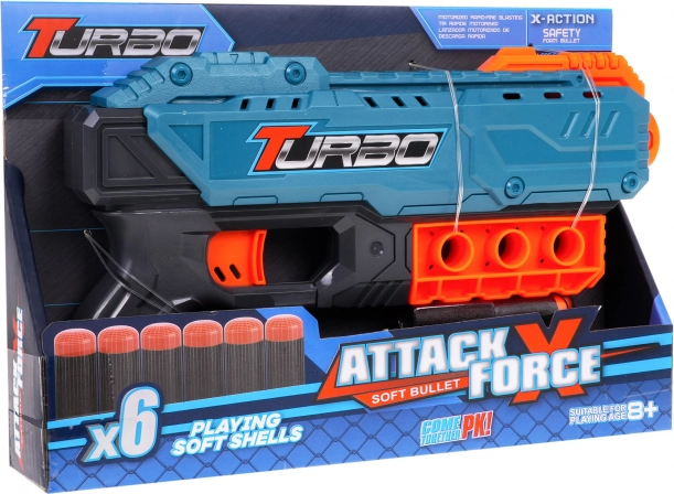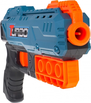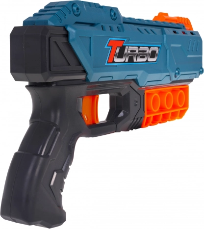 Under løbet er der tre åbninger til opbevaring af ekstra projektiler, så I hurtigt kan fortsætte legen. Ergonomisk greb og let konstruktion gør Turbo til et godt valg for unge skytter, der ønsker enkel betjening og pålidelig ydeevne.