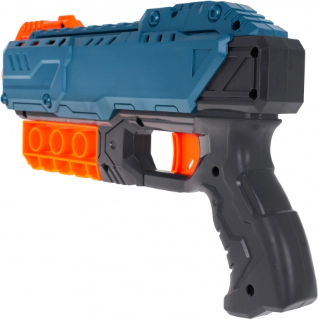 Sjov og sikker børnepistol Turbo i blå til børn fra 8 år byder på manuel ladning uden batterier, bløde skumprojektiler med gummispids og lang rækkevidde. I pakken finder du 6 projektiler, og på blasterens krop er der holdere til hurtig reserve.
