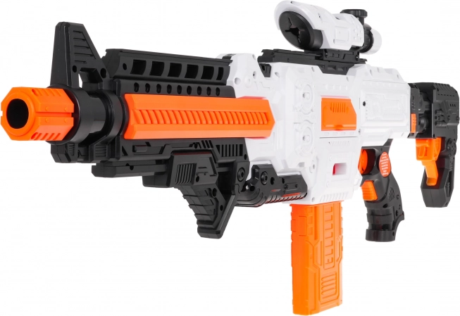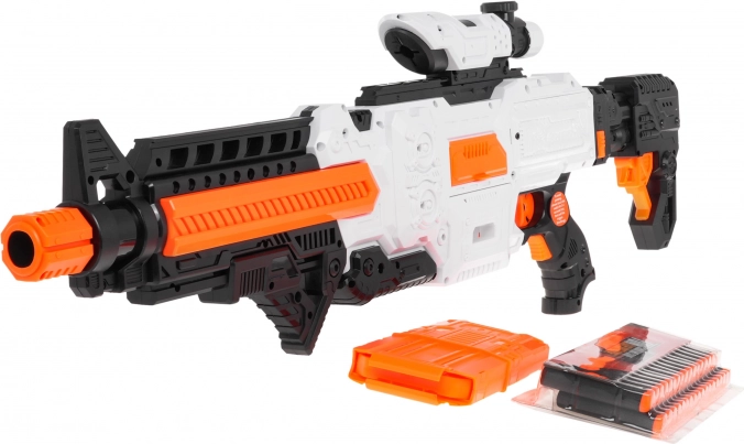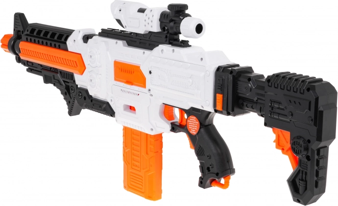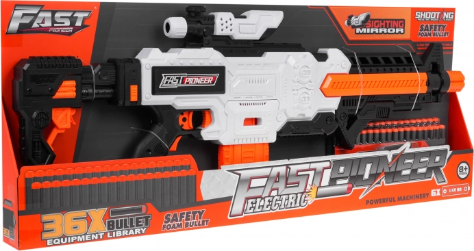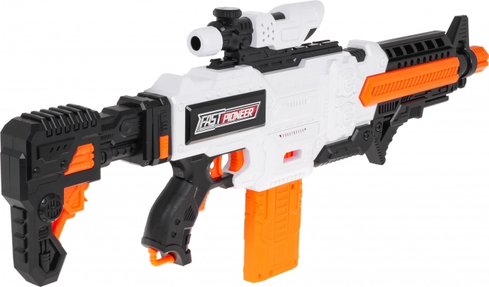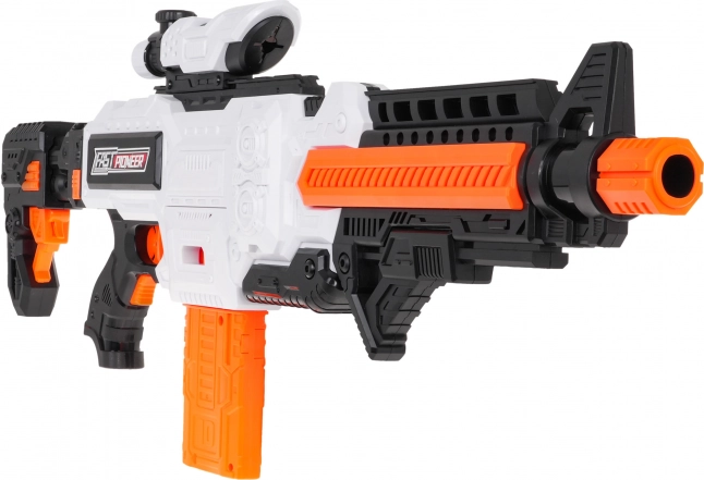Fast Pioneer-blasteren i hvid-orange-sort design er ideel til både indendørs og udendørs kampe. Den halvautomatiske mekanisme med fjeder giver hurtig og jævn affyring med enkeltstående skud. Fyld blot magasinet, hold strømknappen nede, sigt og tryk på aftrækkeren.