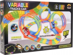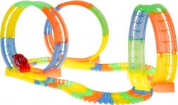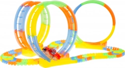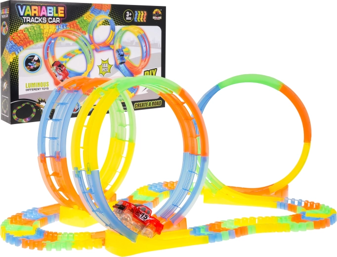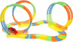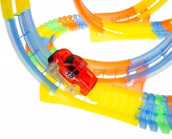 En lysende bane til mørke med 3 loops og en lille bil, som er en del af sættet, egnet til børn fra 3 år. Sættet består af 148 dele. Der er både lige strækninger og loops, hvor bilen drejer 360 grader. Banedelene er fluorescerende og lyser i mørke. Køretøjet i sættet har LED-belysning, hvilket skaber en fantastisk effekt ved kørsel i mørke. Bilen drives af 2 x AA-batterier (medfølger ikke). For at starte bilen skal du blot trykke på knappen på taget. Den samlede banelængde er op til 468 cm.