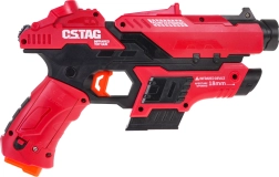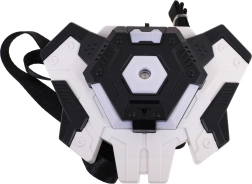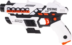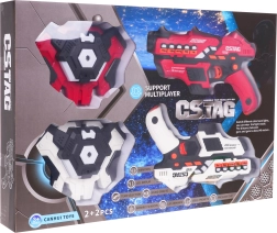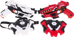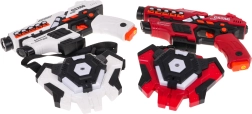 Dette sæt med laserpistoler og mål med røgfunktion er beregnet til børn fra 3 år. Sættet indeholder 2 laserpistoler og 2 mål. Der er fem skydeindstillinger at vælge imellem, og I kan danne to til fire hold. Pistoler og mål arbejder med infrarød stråling; den infrarøde signaludsendelse, der anvendes i dette sæt, er sikker for børn og skader ikke øjnene. Hvert våben har en livstæller, og ved hvert præcist skud og træf på modstanderen bipper og vibrerer både våben og vest. Vibrationer og skydelyde giver hver bruger en fantastisk oplevelse. Når “livs”-magasinet er opbrugt, slukker lyset på pistolen, og der begynder at komme røg ud af målet (husk at fylde målet med destilleret vand på forhånd). Pistolerne er lette og ligger godt i hånden. Rækkevidden i kamp bør ikke overstige 40 meter. Våbnene drives af 3 x AA 1,5V batterier (per våben), og vestene drives af 3 x AA 1,5V batterier (per vest). Konfiguration af sættet - isætning af batterier i pistoler og veste, - opret hold, op til 4 hold (rød–grøn–blå–hvid) - ændring af registrerings-/detekterings-tilstand, - virtuel genopladning af våbnet Våbenfunktioner: - livstæller, - opladningsudløser (lad op ved at klikke/trække på magasinets håndtag), - knapper til at skifte våbentype: enkelskud, maskingevær, haglgevær, laser, pistol, - aktiveringsknap over aftrækkeren, - knap til at skifte hold og skydetilstand (single/continuous), - modtager af infrarød stråle. Våbentilstande: Enkelt skud med 9 patroner, ved træf mister du 1 liv, Laservåben med 9 patroner, ved træf mister du 1 liv, Haglgevær med 6 patroner, ved træf mister du 2 liv, Maskinpistol med 6 patroner, ved træf mister du 2 liv, Maskinpistol med 6 patroner, ved træf mister du 2 liv, | |