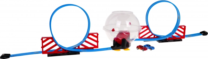 Byg din egen racerarena med dobbeltsporet bane, to loops og en central gennemsigtig kugle. Takket være to uafhængige ruter kan børn arrangere ægte fartdueller. Ved at trække bilen tilbage aktiveres pull back-drevet, og bilen suser mod loopet, låser sig i kuglen og udfører medrivende rotationer indeni.