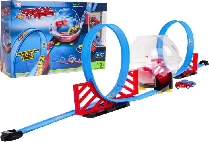 En sjov dobbeltsporet racerbane med gennemsigtig kugle giver børn fra 3 år timevis af action og fantasi. To separate baner med glidende loops og en central kugle gør det muligt at køre løb to ad gangen. Bilerne med pull back-drev klarer en 360° loop, kører ind i den gennemsigtige runde kammer og snurrer i høj fart indeni. Sættet har 28 dele for nem samling og indeholder 2 racerbiler samt dekorative klistermærker.