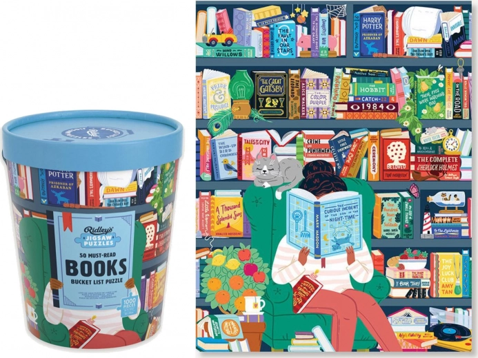 Opdag litteraturens verden med originale puslespil med 1000 brikker, der præsenterer 50 ikoniske bøger i smukke illustrationer. Stilfuld emballage i form af en spand, vedlagt motivskabelon og format ca. 55 × 70 cm efter samling. Teksterne på puslespillet er på engelsk.