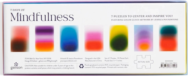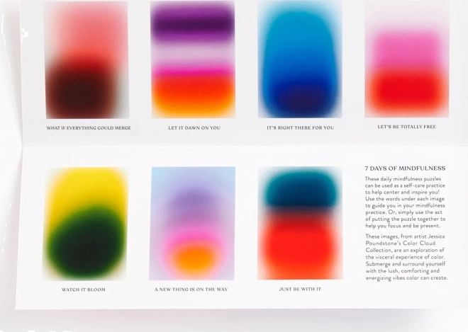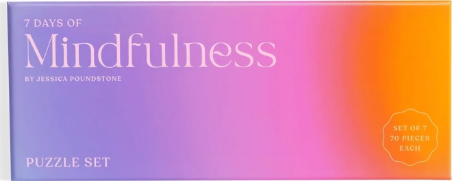 Sættet “7 dages mindfulness” tilbyder syv originale mini-puslespil med abstrakte farveskyer af JESSICA POUNDSTONE. Hvert puslespil har 70 brikker og måler efter samling cirka 17,8 × 12,7 cm – den perfekte størrelse til kort, beroligende samling hjemme eller på farten. Emballagen er æstetisk udført og af genbrugspapir, hvilket glæder både design- og bæredygtighedsentusiaster.