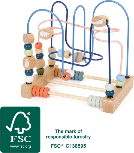 Denne motoriske labyrint er lavet af FSC®-certificeret træ og giver langvarig underholdning for børn. Med træperler og skydelige elementer med motiver af isbjørn, sæl og sneugle bliver børnene godt underholdt, mens de udvikler deres finmotorik og hånd-øje-koordination. Tællere med ringe giver yderligere legemuligheder og lærer børn at tælle på en sjov måde.