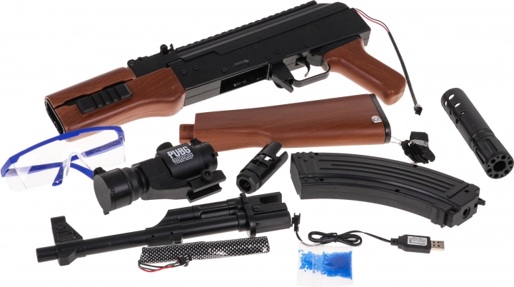 - pistol, magasin, lyddæmpertilsats, næsestykke, USB-kabel, 3,7 V batteri, pose med gelkugler, strop, beskyttelsesbriller, manual