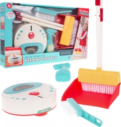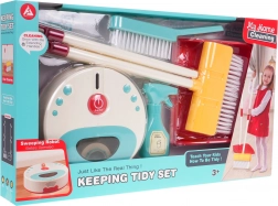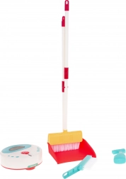Der medfølger rigt tilbehør til komplet rengøringsleg: kost og fejebakke på stativ, håndkost og en sikker attrap af rengøringsmiddel. Sættet er ideelt til at træne finmotorik, ansvarlighed og daglige vaner.