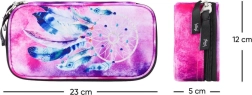 Det populære skolepenalhus med et attraktivt dreamcatcher-motiv kombinerer moderne design og praktisk funktionalitet. Takket være den solide udførelse tåler det daglig brug og holder dine skoleartikler sikre og velorganiserede. Den udklappelige skillevæg med elastiske stropper holder blyanter og penne på plads, mens den indvendige lynlåslomme rummer småting.