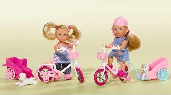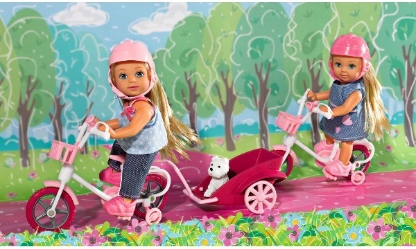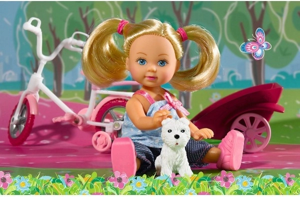 Dukken Evi Love bringer børn vidunderlige historier fulde af eventyr. Med den trehjulede cykel og den aftagelige anhænger kan Evi sikkert køre sin hvide hund på ture. Takket være de bevægelige knæ sidder hun let på cyklen, og børn kan nyde realistisk leg med fokus på bevægelse og omsorg for et dyr.