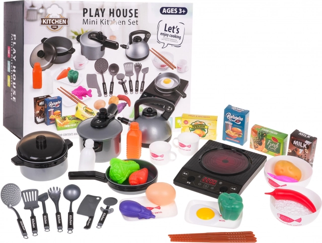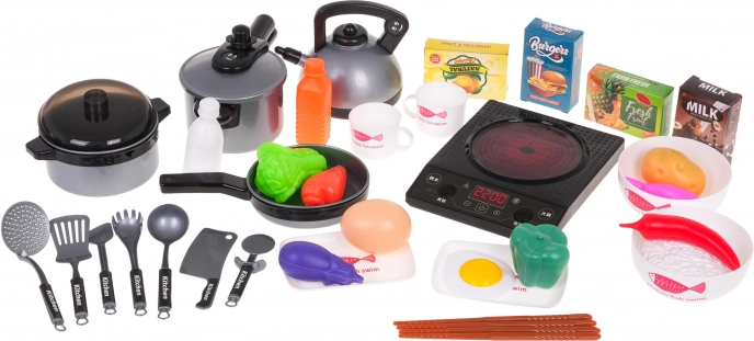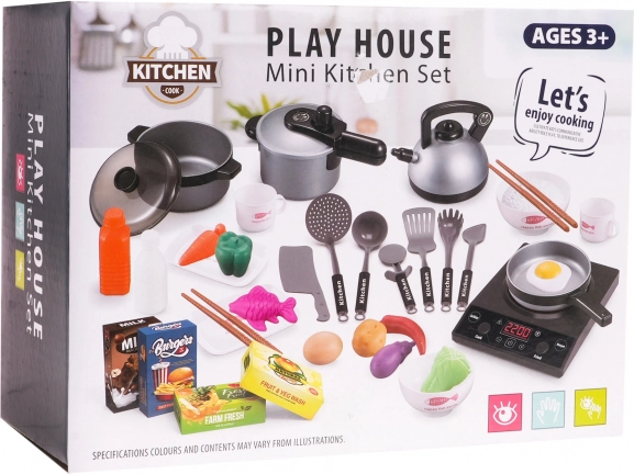 Dette fantastiske køkkensæt indeholder alt, hvad en lille kok kan få brug for. En induktionskogeplade, der drives af tre AA-batterier, giver realistiske lyde af stegning og kogning, og sikre plastdele såsom gryder, pander og andet tilbehør er ideelle til børns leg uden skarpe kanter og risiko for skader. Sættet indeholder forskellige imitationer af madvarer, herunder æg, fisk og grøntsager, som øger autenticiteten i legen.