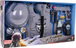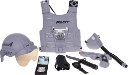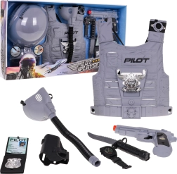 Dette lille pilotsæt er ideelt legetøj for børn, der elsker at opdage nye verdener og prøve rollen som pilot. Sættet indeholder hjelm med beskyttelsesbriller, polstret vest med elastikbånd, maske med mulighed for fastgørelse, og interaktiv legetøjspistol, der laver skudlyde. Sikrer endeløs underholdning og udvikler fantasien.