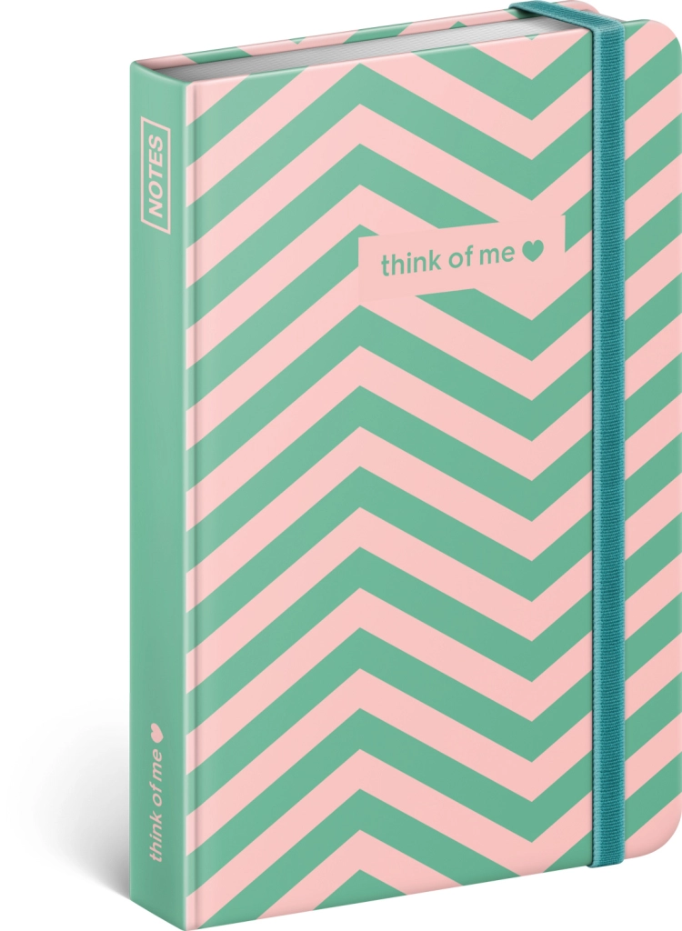 Stilfuld notesbog med Think of Me-motiv og hård bogindbinding, suppleret med en praktisk elastiklukning.