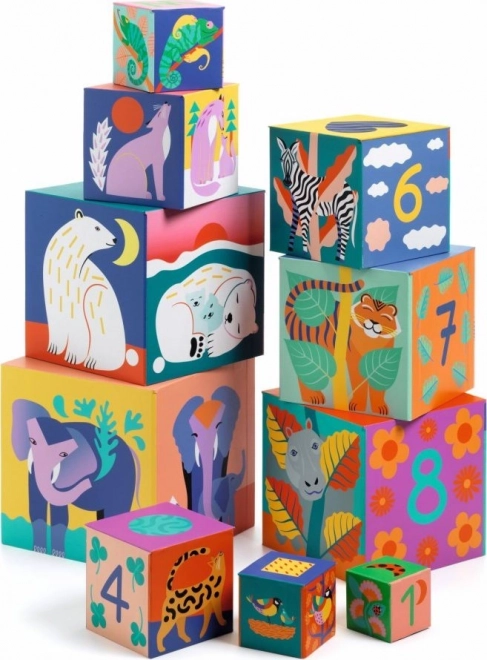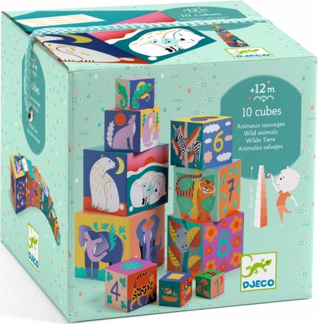 Hver klods viser tallene 1–10 og glade illustrationer af vilde dyr, som støtter tidlig læring og ordforråd.