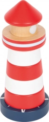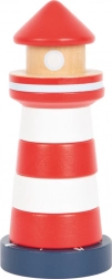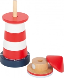 Dette træstabeltårn i form af et klassisk rød-hvidt fyrtårn giver børn fra 1 år glæden ved at udforske og stable. Syv farvede ringe stables på en stabil base med en fleksibel stav, som øger sikkerheden under legen. At lære at rangere efter størrelse støtter logisk tænkning og tålmodighed.