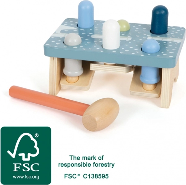 Når én pind bankes ned, skydes en anden på den modsatte side op. Børn tilegner sig på legende vis principperne om årsag og virkning og bevarer længere koncentrationen.