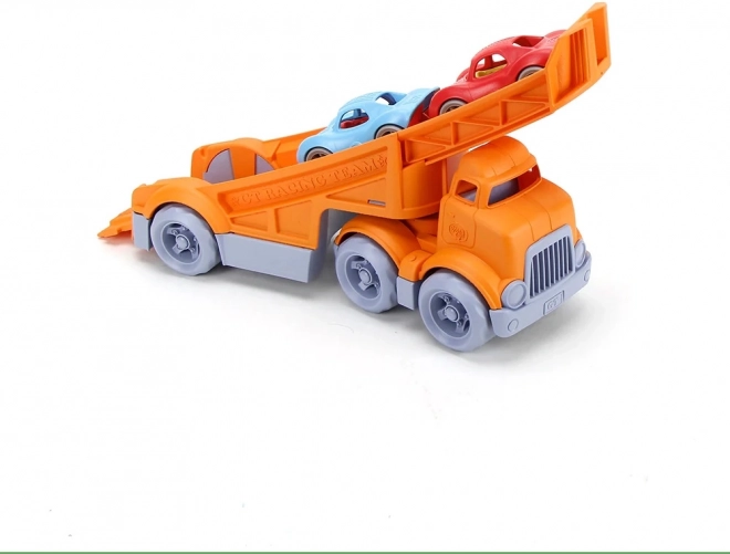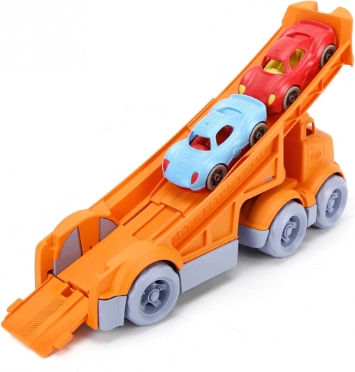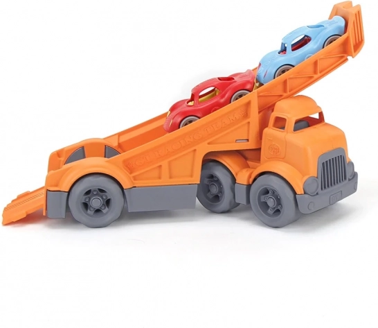 Det miljøvenlige transportsæt fra Green Toys giver sikker og sjov leg for de mindste. Den robuste orange lastbil med en lang påkørselsrampe transporterer to farverige racerbiler. Fremstillet af genbrugsplast fra mælkeflasker, uden BPA, ftalater og PVC, velegnet til hjemmet, sandkassen og vand. Let vedligeholdelse – kan vaskes i opvaskemaskinen.