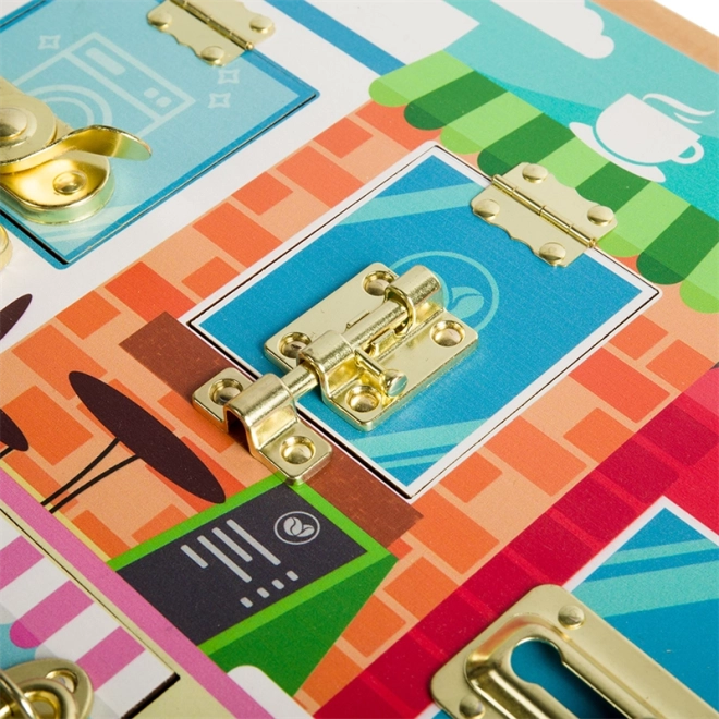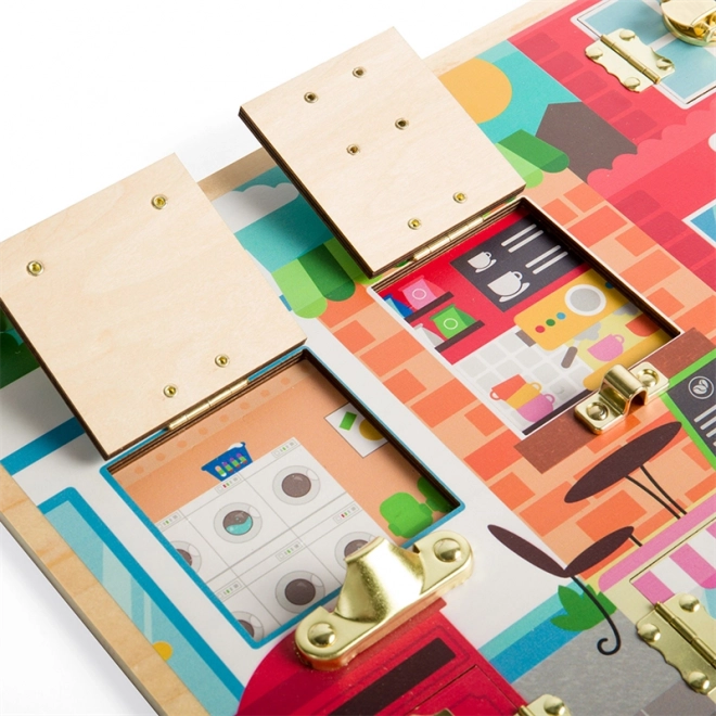 Dette kvalitets motorikbræt i Montessori-stil giver børn et trygt rum til at træne greb, tålmodighed og problemløsning. Bag hver dør med en forskellig type lukning gemmer der sig en farverig scene (vaskerum, køkken, café m.fl.), som motiverer til udforskning og styrker fantasien.