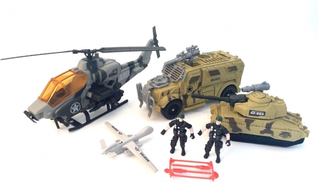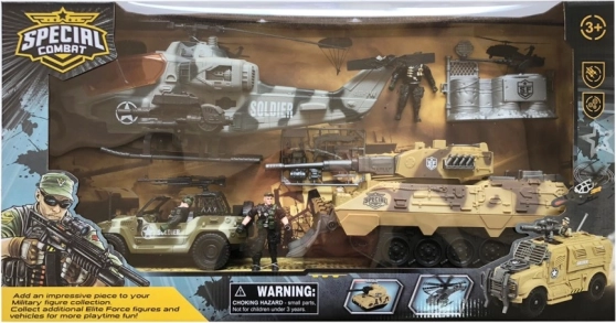 Sættet indeholder forskellige militærkøretøjer, herunder en terrængående bil og en tank, ideel til rekognosceringsmissioner.