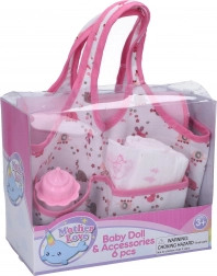 Praktisk sæt med tilbehør til dukker, som gør det lettere for børn at lege mor og far. Pakken indeholder alt nødvendigt til daglig pleje – taske til tilbehør, ble, flaske, stofble og pusleunderlag.