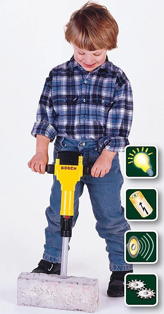 Det pneumatiske hammerlegetøj BOSCH fra Klein er en tro kopi af det rigtige værktøj og passer perfekt til små byggere. Det gule design med sorte og sølvfarvede elementer, rødt BOSCH-logo og effektiv ergonomi understøtter udvikling af fantasi og finmotorik.