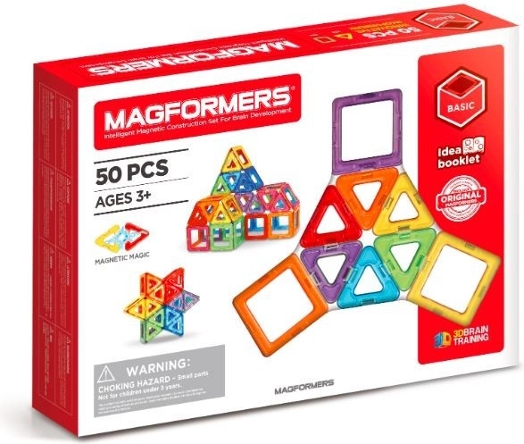MAGFORMERS SET 50 er blokke med indbyggede, stærke neodymmagneter, som altid tiltrækker hinanden. Det er nok at føre siderne på to blokke tæt sammen, og de kobler sig straks. Takket være blokke formet efter geometriske figurer kan du bygge smukke tredimensionelle konstruktioner. Til legen kan du bruge den vedlagte vejledning eller flere eksempler på siderne magformersworld.com – eller din egen fantasi. Sættet indeholder: 26 trekanter og 24 firkanter.