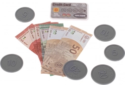 Sættet inkluderer forskellige former for børnepenge, kreditkort og et bredt udvalg af varer, hvilket tilføjer en realistisk fornemmelse til leger på handel.