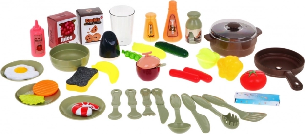 42 stykker varieret tilbehør, inklusive tallerkener, skåle, bestik og simuleret mad, tilbyder uendelige legemuligheder.