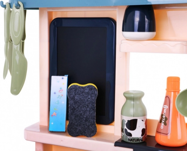 Sættet inkluderer også rigt udstyr, inklusive en tavle til noter, gryder med låg, pander, tallerkener, bestik, simuleret mad som grøntsager og frugt, og meget mere. Dens stabile konstruktion og pastelfarver giver ikke kun sjov, men også en æstetisk oplevelse.