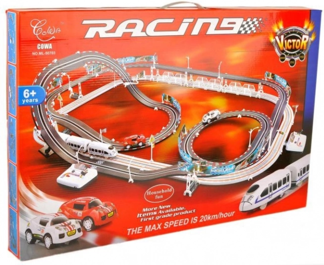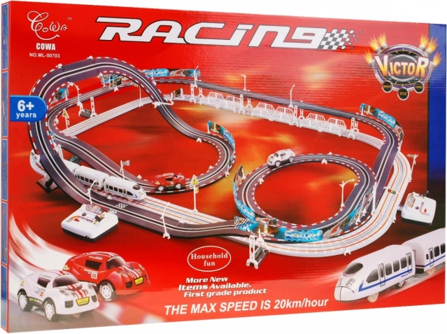 Dette store racerbane 2 i 1 bringer spændingen fra løbet direkte ind i dit hjem. Designet til børn over 6 år, tilbyder skarpe sving, serpentiner og lige strækninger af banen, der giver maksimal sjov. Med hastigheder op til 20 km/t kan bilerne og togene konkurrere uden sammenstød på deres ruter.