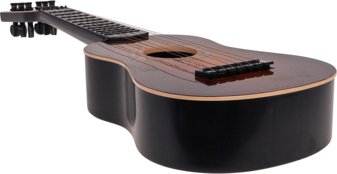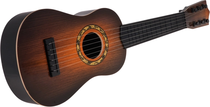 Denne klassiske børneguitar i mørkebrun udførelse efterligner troværdigt et rigtigt instrument. Den har seks metalstrenge og fungerende skruer til grundlæggende stemning, så barnet får en autentisk spilleoplevelse og motiveres til at udvikle rytme og gehør.